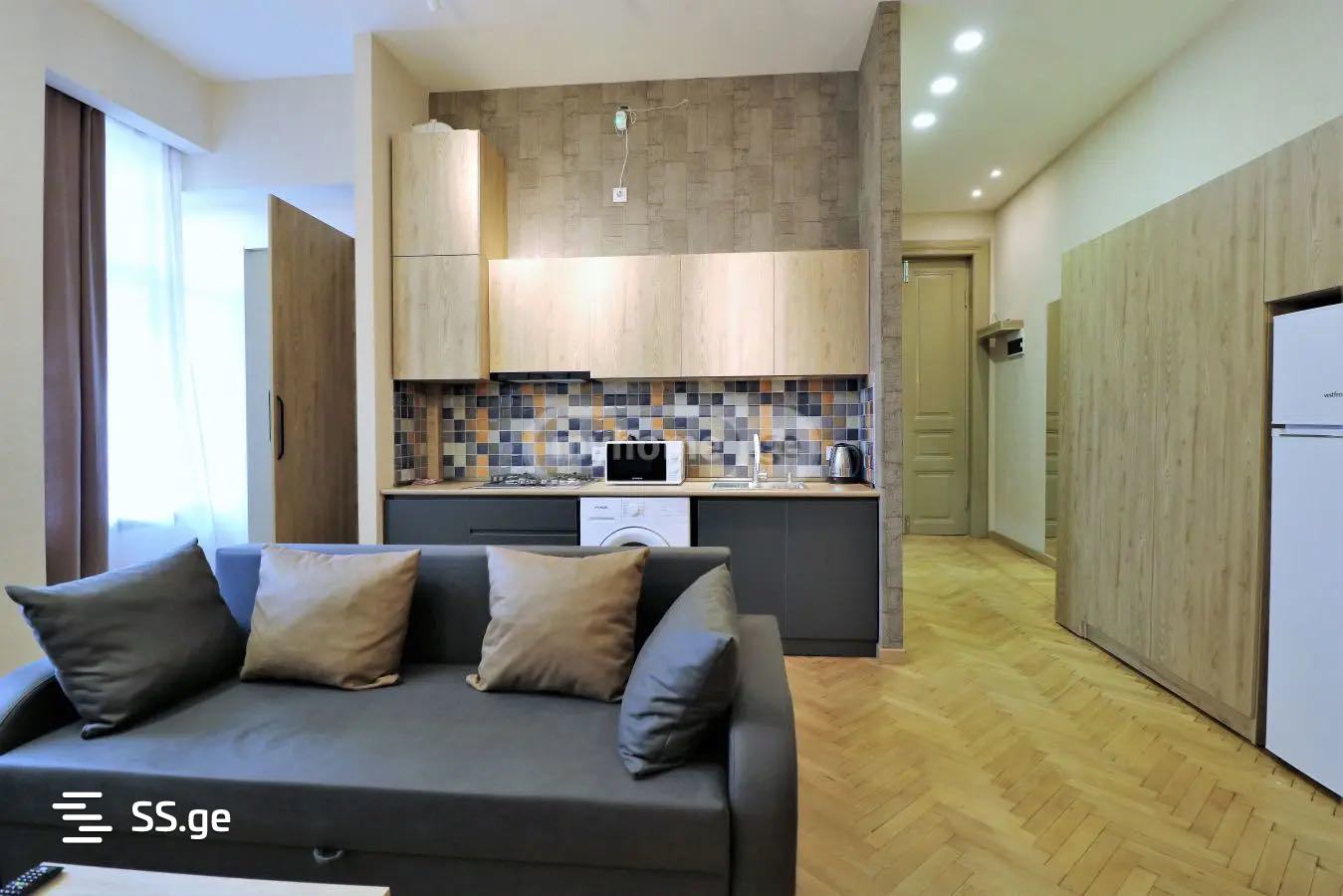 Сдается недавно отремонтированная квартира-студия в центре города, на проспекте Руставели, по адресу Ал Чавчавадзе 5. Это в 2 минутах ходьбы от метро. Арендная плата за первый и последний месяц должна быть оплачена заранее.