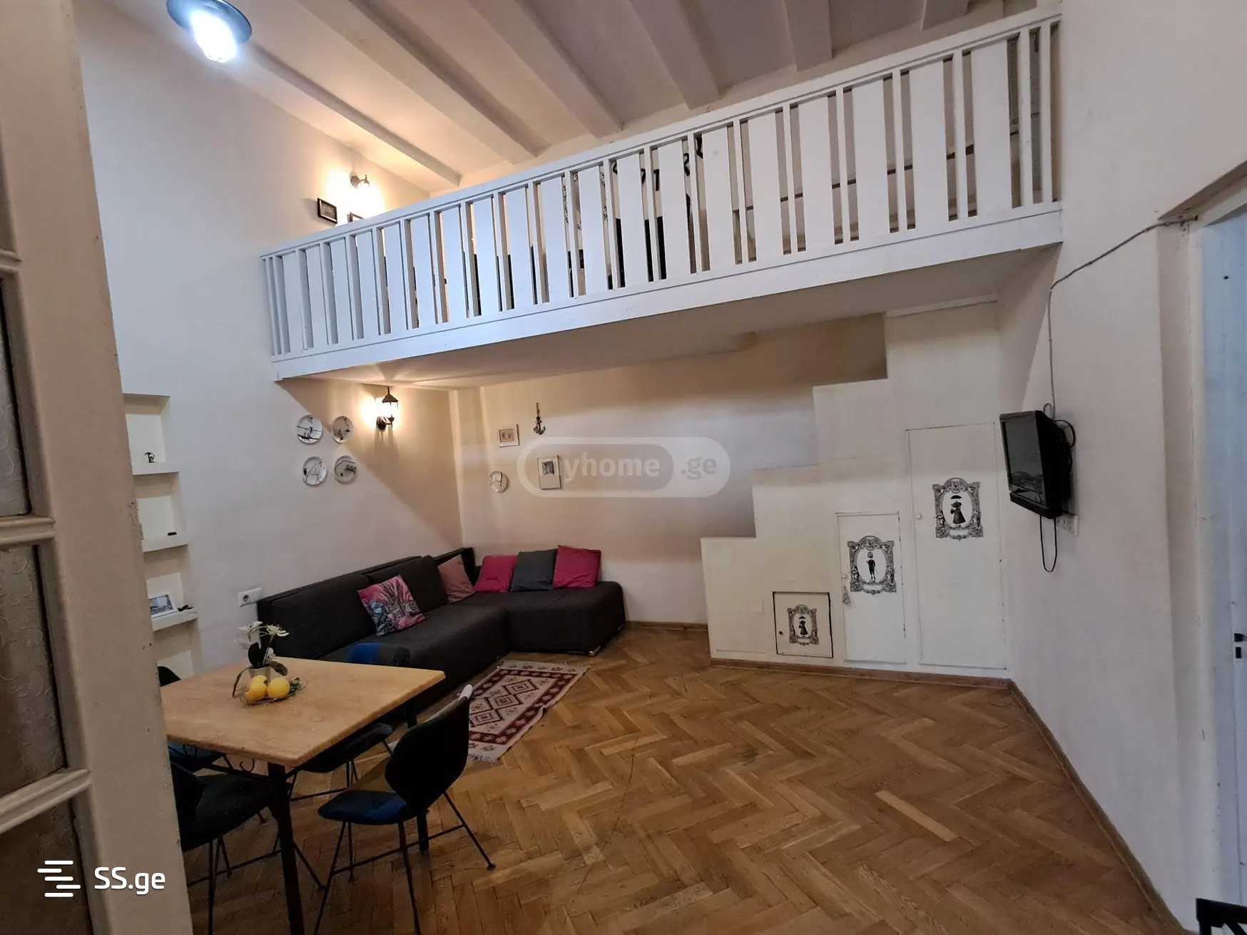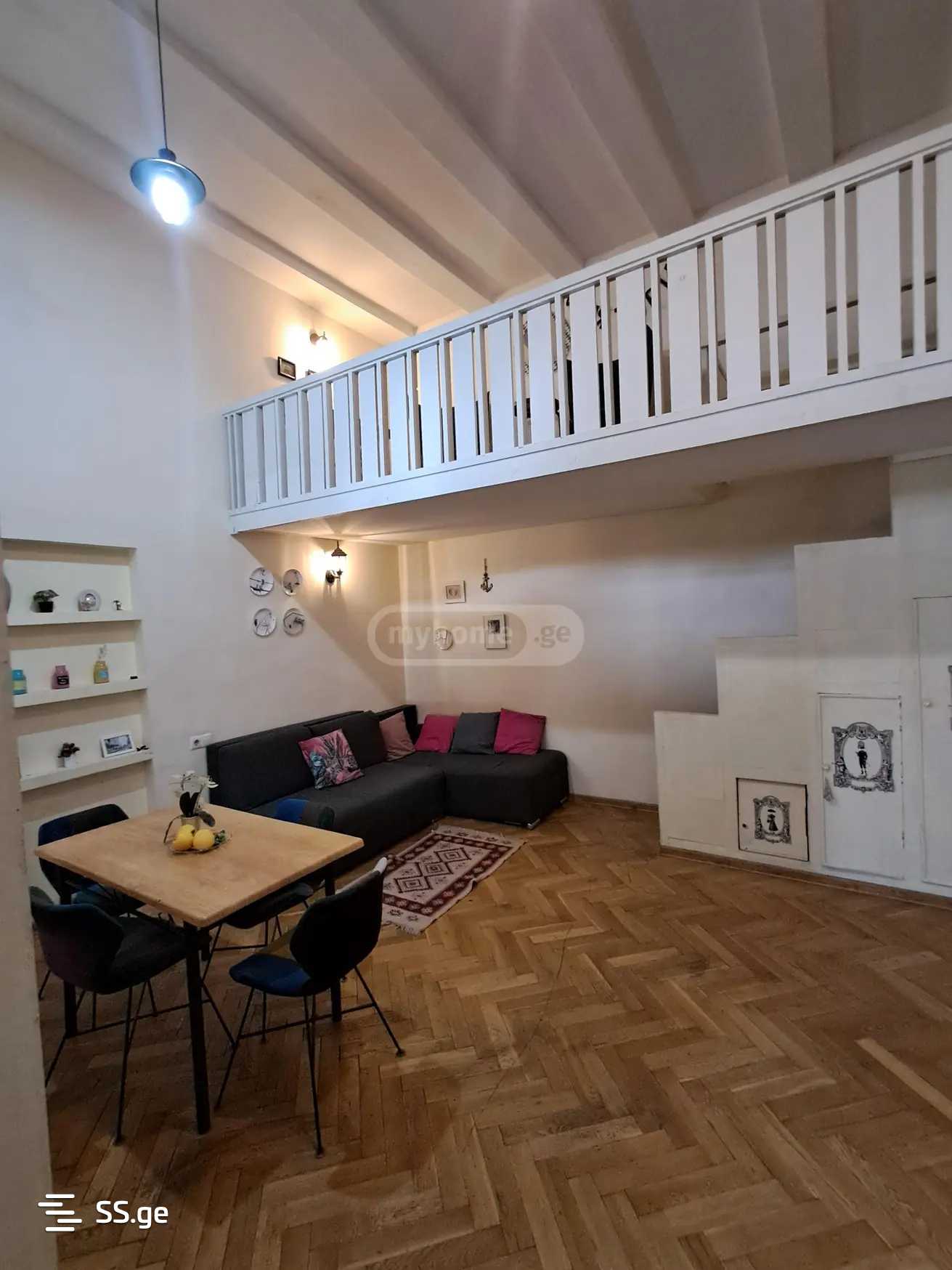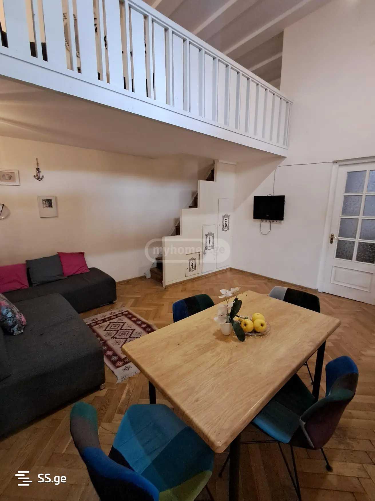 Комментарий: A beautiful well-furnished apartment with a mezzanine is for rent near the Marjanishvili Metro on Agmashenebeli Avenue. The apartment is in an Italian courtyard. Payment is for the first and last month.