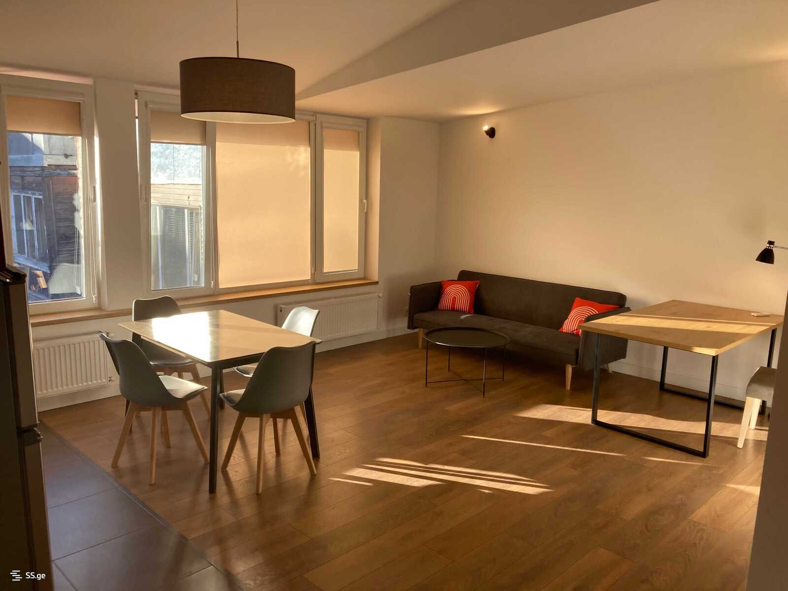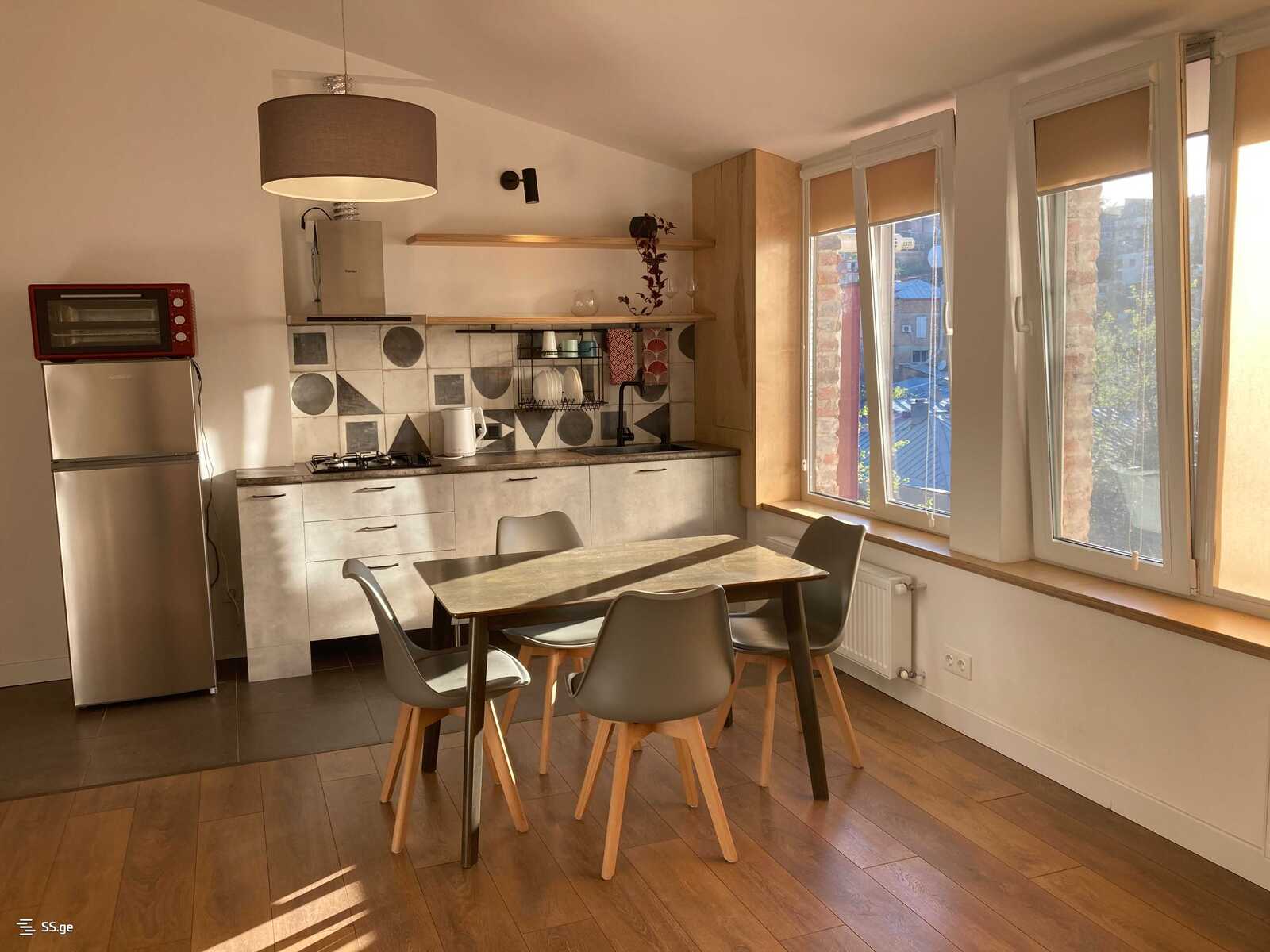Сдается в аренду: 2-комнатная новопостроенная и отремонтированная мансарда с высокими потолками на Руставели. С перекрестной вентиляцией, светлая и уютная, большие окна и вид на обе стороны (на Руставели и Мтацминду).