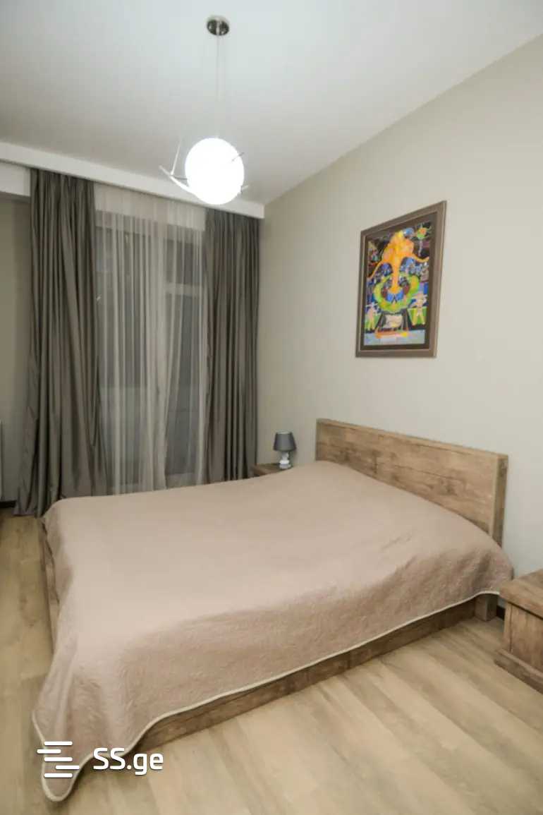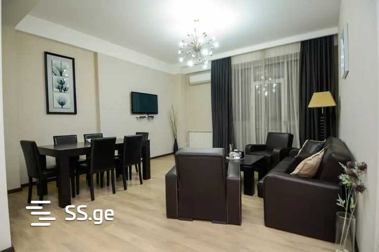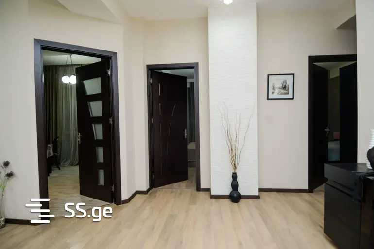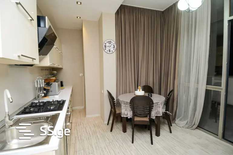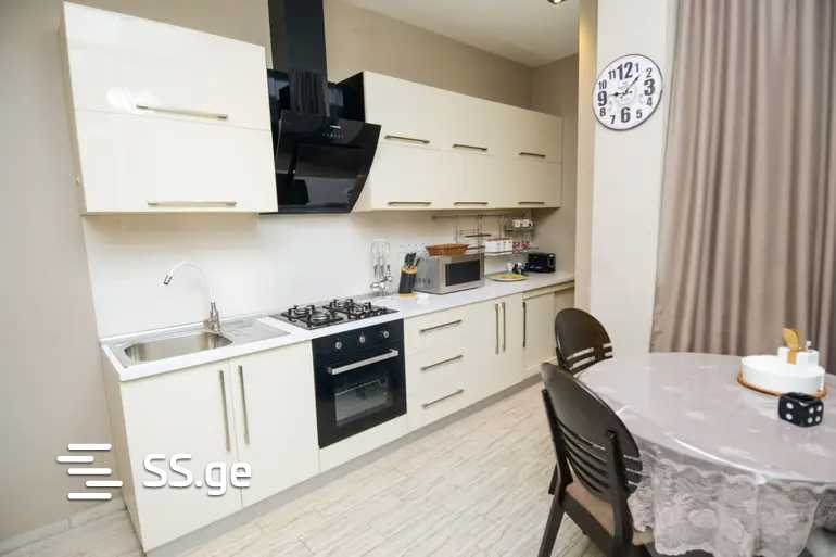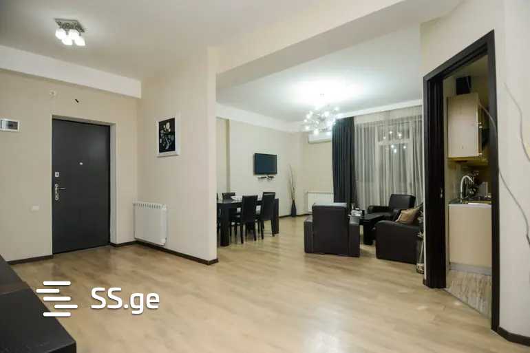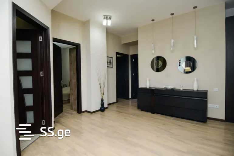 Комментарий: For rent: a newly built 120 sq.m apartment in "Mziuri Towers". The apartment has 3 rooms, 2 bedrooms, and 2 bathrooms, furnished and equipped with appliances. There is parking for a car.