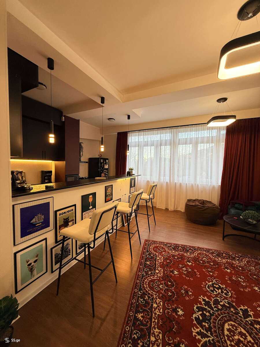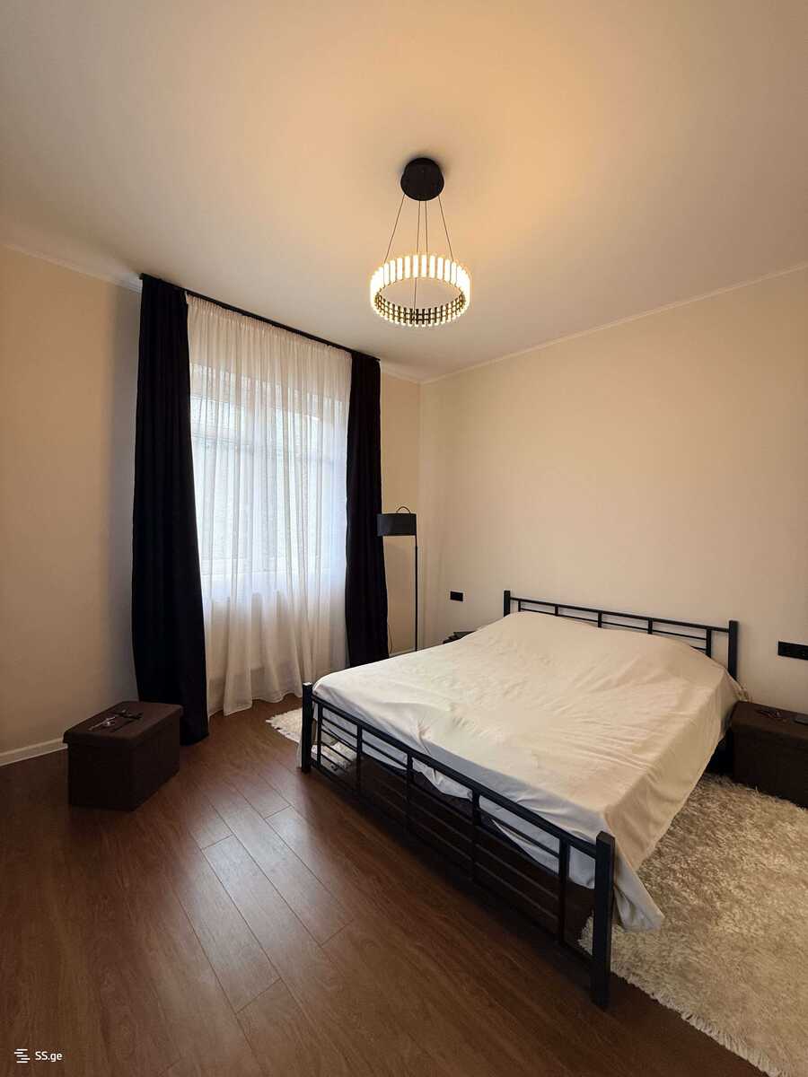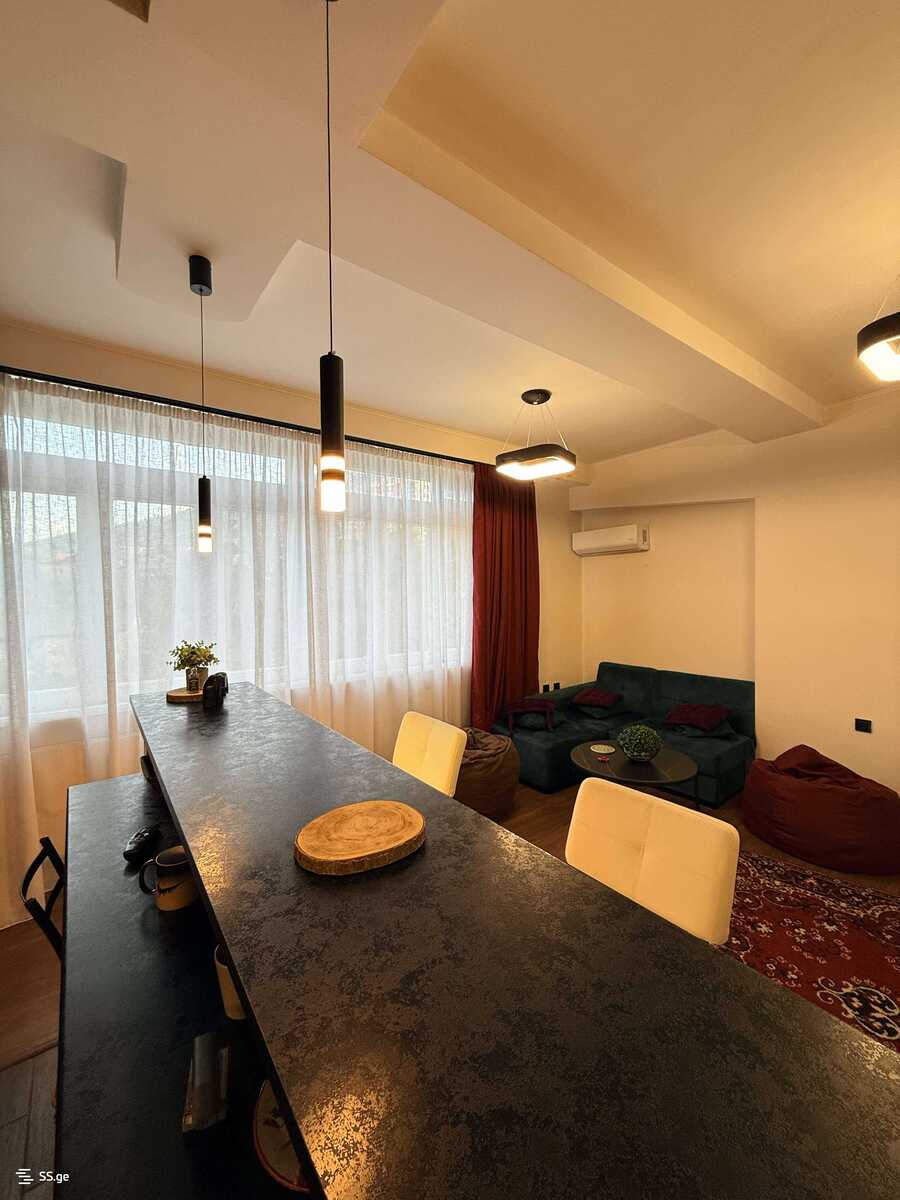 Комментарий: For rent in Vake, Nino Zhvania Street #12, a 3-room apartment with a studio-type living room and a fireplace. The apartment has 2 bedrooms, 1 bathroom, and a balcony with a beautiful view. The apartment is newly renovated, equipped with central heating, and fully furnished with furniture and appliances. The entrance is secured with a chip system. It's possible to have a small dog, under the condition of a deposit. ? Price: 900 $