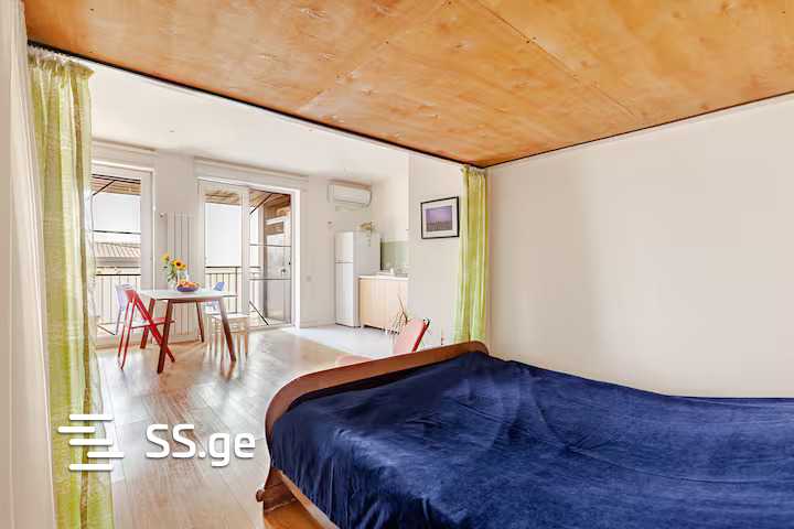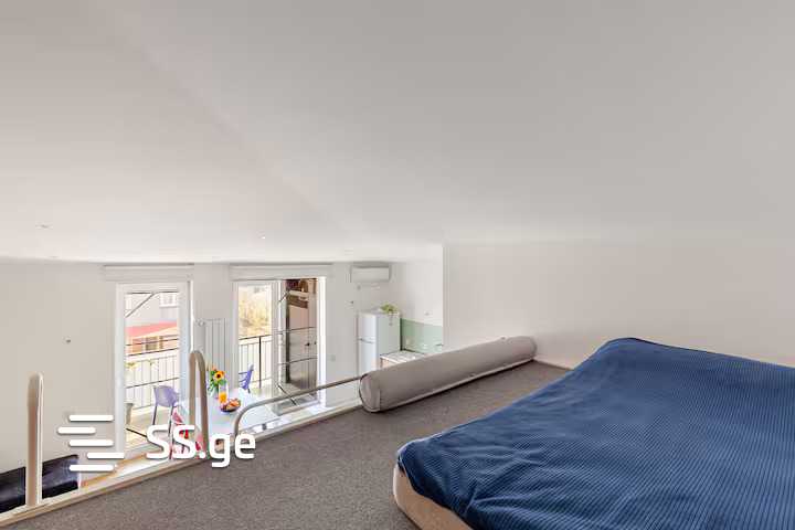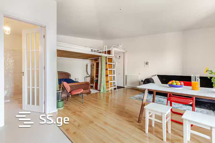 Studio apartment with a mezzanine. Basic furniture remains in the apartment.