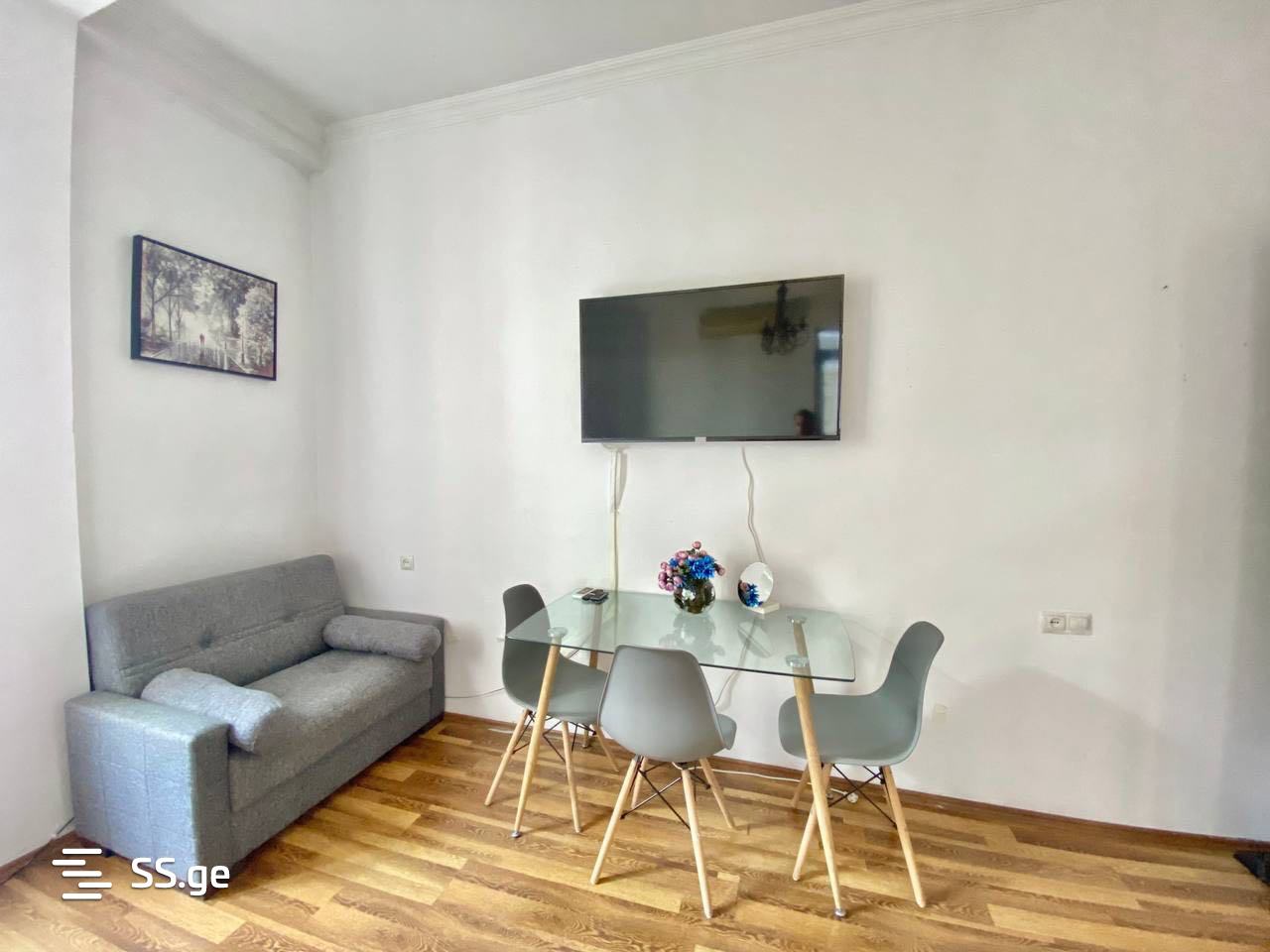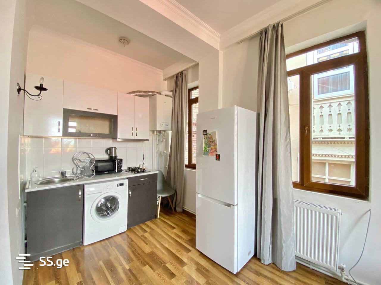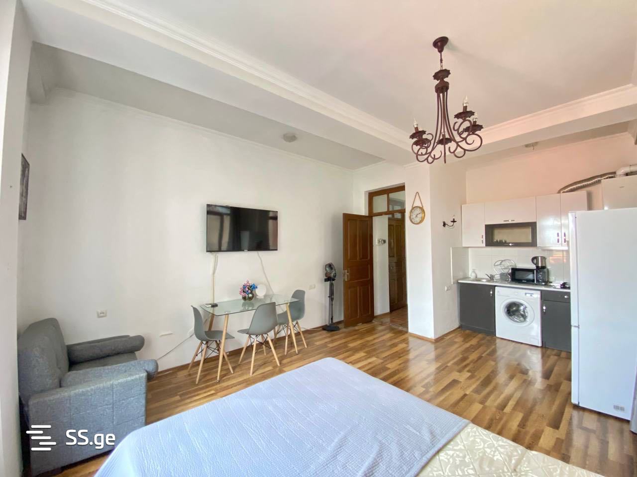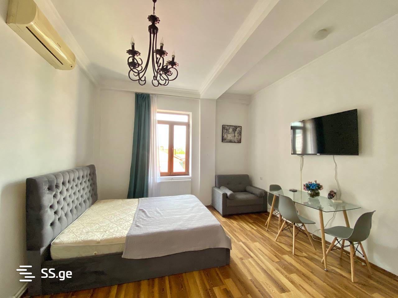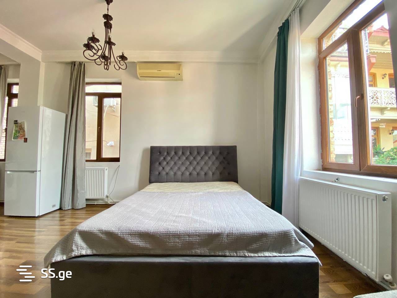 A cozy and bright studio-type apartment is for rent in the historical district of Old Tbilisi. With furniture and appliances.